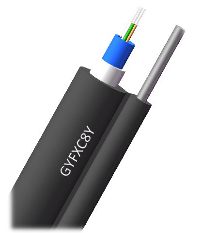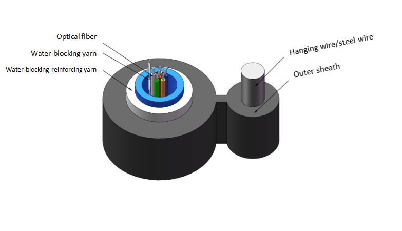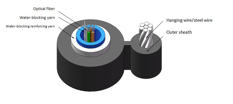 De structuur van de optische kabel is om single-mode of multi-mode optische vezels in een losse buis te plaatsen, gemaakt van hoog modulus plastic met waterblokkerend garen in een volledig droog type en gevuld met waterblokkerend materiaal, en deze in het midden van de kabel te plaatsen. Rond de losse buis wordt waterblokkerend versterkingsgaren (zoals glasgaren, aramidegaren en andere niet-metalen garens, enz.) geplaatst, en vervolgens wordt een polyethyleen (of andere kunststoffen of vlamvertragende kunststoffen, enz.) mantel geëxtrudeerd en gewikkeld. Tegelijkertijd worden staalkabels of enkele ronde staaldraad ophangdraden toegevoegd om de kabel te vormen.
