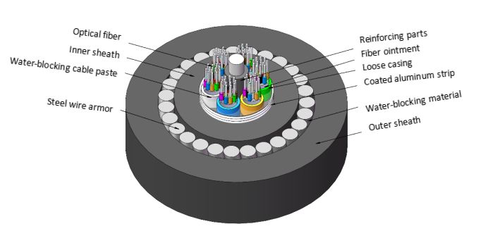 De structuur van de optische kabel is om optische vezels met één of meerdere modus in een losse buis te plaatsen die is gevuld met een waterdichte verbinding van hoogmodulaire kunststof.In het midden van de kabel kern is een metaal versterkingscomponentHet omvat metalen versterkingscomponenten, losstaande laag met strenge vulvorm, aluminium-polyethyleen gebonden binnenste omhulsel, fijne ronde staaldraadbescherming,met een diameter van niet meer dan 20 mm,Voor een aantal optische kabels wordt een laag polyethyleen om het metalen centrale versterkingselement geextrudeerd.Losse buizen (en vultouwen) worden om het centrale versterkende element gedraaid om een compacte en ronde kabelkern te vormenDe gaten in de kabelkern worden gevuld met een waterdichte verbinding, en een aluminium-polyethyleen gebonden binnenste behuizing wordt geëxtrudeerd.de gaten worden gevuld met water-blokkerende verbinding, en vervolgens wordt de buitenmantel van polyethyleen geëxtrudeerd om de kabel te vormen.