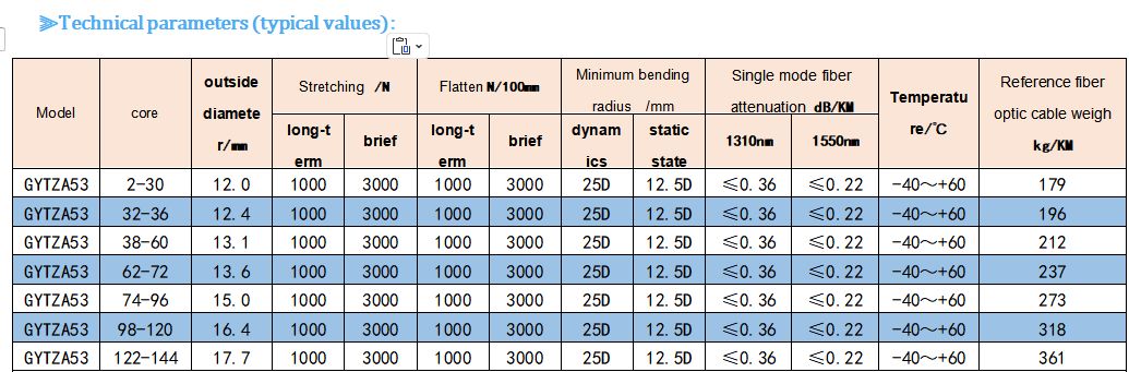 [Metalen versterkingscomponent, losse hoeslaag volledig gevuld, aluminium vlamvertragend polyethyleen gebonden binnenste behuizing, stalen band harnas, flame retardant polyethylene outer sheath communication outdoor optical cable] The structure of the optical cable is to encase single-mode or multi-mode optical fibers in a high modulus plastic filled waterproof compound loose sleeveHet middelpunt van de kabelkern is een metaalversterkingscomponent.het niet-metalen middelste versterkingscomponent is ingepakt met een polyethyleen kussenschaal, en de losse mouw (en het vultouw) wordt om het middelste versterkingscomponent gedraaid om een compacte en ronde kabelkern te vormen.De gaten in de kabelkern worden gevuld met waterbestendige verbindingen, en de buitenste geextrudeerde aluminium polyethyleen gebonden binnenste behuizing wordt gebruikt voor stalen bandbeveiliging van de binnenste behuizing. gevuld met waterbestendige verbindingen,met een breedte van niet meer dan 50 mm,.