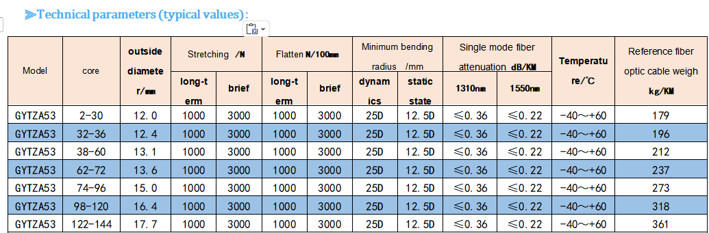 ¢ Productkenmerken: 1 Een redelijk ontwerp en een nauwkeurige controle van de resterende lengte en de bekabeling van de glasvezel in de losse buis,De optische kabel heeft een uitstekende mechanische en milieuprestatie; 2 Het buitenste deel van de versterking en het binnenste deel van de kabelkern zijn gevuld met waterdichte kabelpasta, waardoor het vocht- en waterdichte effect van de optische kabel wordt gewaarborgd;3 De dubbele laag metalen banden in de lengte van het pakket en de dubbele laag van de omhulsel zorgen voor een sterke trek- en zijdelingse drukweerstand4 De omhulsel is gemaakt van vlamvertragend polyethyleen,die een goed vlamvertragend effect heeft en kan worden gebruikt op plaatsen waar vlamvertragende eisen gelden.